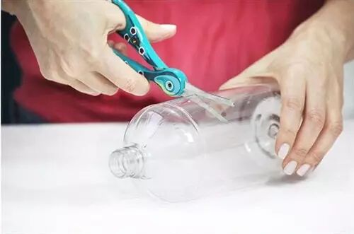 2、用剪刀把瓶口往下1/3的部分剪掉,在瓶底均匀地戳出略小于绿豆的小洞,多戳几个洞,豆芽呼吸会更加顺畅。